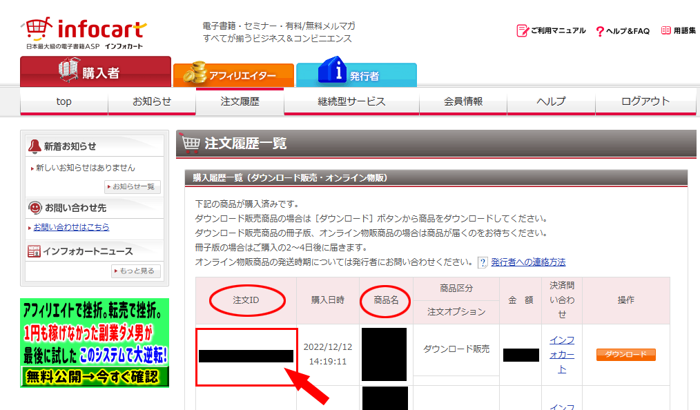 インフォカートの購入者ID確認方法②